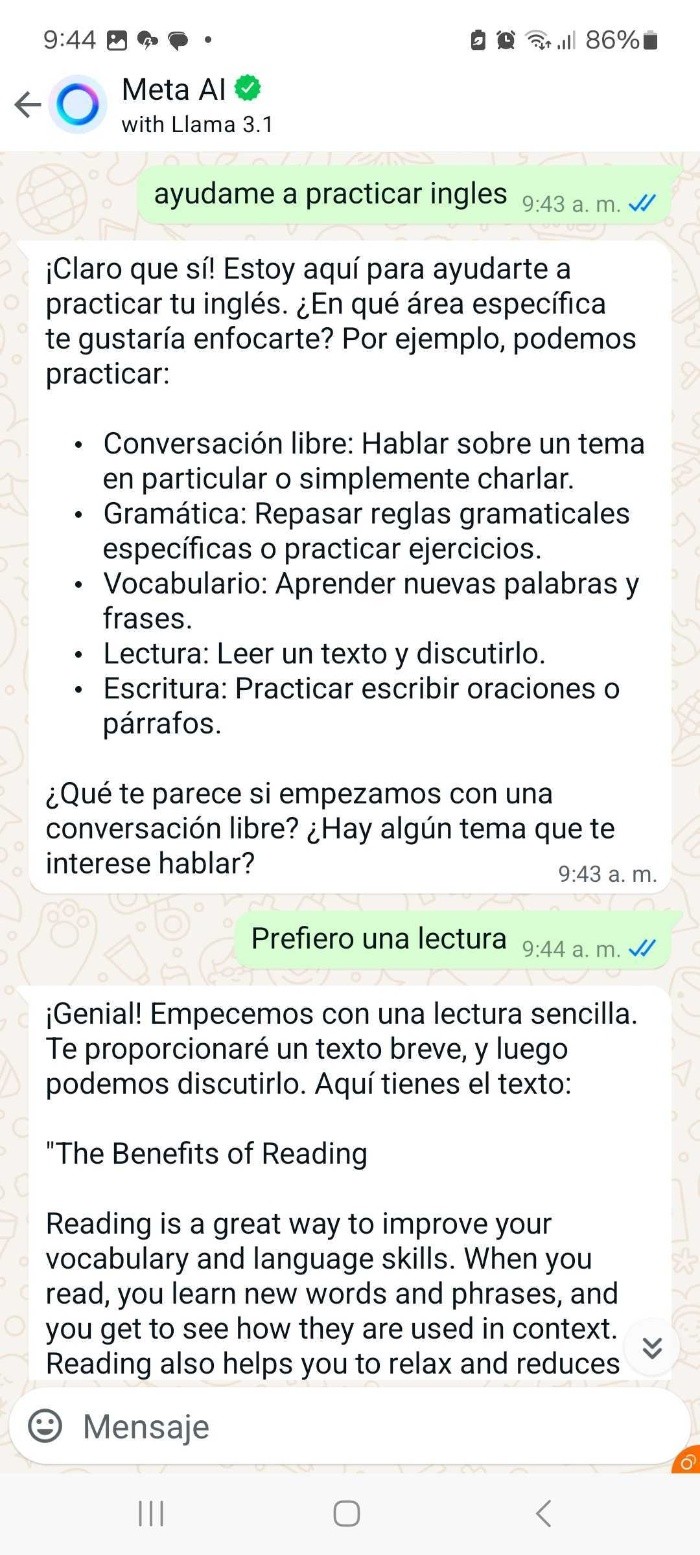 Saber hablar en inglés hoy en día es de vital importancia, puesto que esta es una lengua supercentral, ya que es el idioma global por excelencia. Se emplea para el intercambio cultural con personas que no necesariamente tienen a este idioma como lengua materna. Saber inglés es una importante herramienta de desarrollo personal, pues en muchas ocasiones esto facilita obtener un empleo o ser promovido. De forma popular se dice que el inglés "abre puertas".En la actualidad es uno de los idiomas más hablados del mundo con mil 452 millones de hablantes.En este contexto, existen herramientas cada vez más accesibles que te ayudan a aprender el idioma de forma autónoma, una de ellas es la que ofrece la nueva inteligencia artificial de WhatsApp totalmente gratis.Meta AI es el asistente gratuito disponible en todas las aplicaciones de mensajería de la compañía de Mark Zuckerberg.¿Cómo practicar mi inglés con Meta AI?Puedes identificar esta herramienta por medio de un círculo azul ubicado en la esquina de la pantalla. Esta herramienta, que se presenta como un tipo de buscador, te permite emplearla para pedir recomendaciones o generar imágenes.En este caso, si deseas mejorar tu inglés, debes darle la instrucción a la AI escribiendo un mensaje como "¿Puedes ayudarme a practicar mi inglés?".A partir de esta oración, la AI te brindará recomendaciones para practicar tu inglés, algunas actividades son la discusión de temas o realizar juegos de lenguaje.Puedes comenzar una conversación textual con la AI para mejorar tu inglés.Lo mejor de todo es que la nueva AI de WhatsApp es una herramienta multilingüe, por lo que no únicamente puedes practicar inglés, sino también otros idiomas como alemán, francés, hindi, hindi-escritura romanizada, italiano y portugués.MBLee también:Mantente al día con las noticias, únete a nuestro canal de WhatsApp