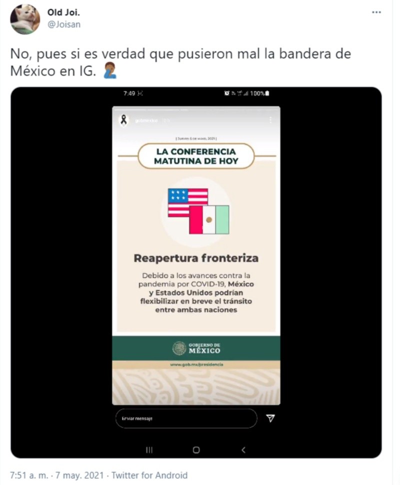La cuenta de Instagram del Gobierno de México fue víctima de la burla de los usuarios que encontraron un error en una publicación que fue compartida y posteriormente eliminada de la red social. Y es que en la plataforma se colocó, de forma errónea, una imagen en la que aparecía una ilustración de la bandera de México con los colores ordenados al revés.Tras la conferencia mañanera del jueves del Presidente Andrés Manuel López Obrador (AMLO), se difundió una ilustración temática de México y Estados Unidos en la que aparecían las banderas de ambos países, aunque la azteca tenía los colores invertidos: primero el rojo, luego el blanco, y al final el verde.La imagen pretendía hablar sobre los avances que hay entre México y EU respecto a la reapertura de la frontera entre ambos países, pues ha permanecido cerrada largo tiempo debido a la pandemia de COVID-19. Ayer se anunció que el Presidente AMLO tendría una reunión virtual este viernes con la vicepresidenta del país vecino, Kamala Harris, en el que se tratarían varios temas. Entre estos destacan el fenómeno migratorio, la reapertura de la frontera, y ''otros asuntos de interés para las dos naciones'', dijo el Mandatario.OF