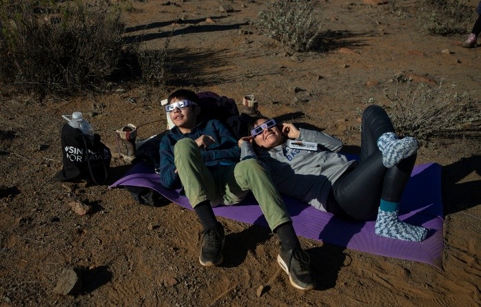 Decenas de miles de personas aplaudieron el eclipse total de sol que miraron desde localidades del norte de Chile, donde están los cielos más limpios del planeta, y sus gritos crecían a medida que la luna cubría el sol por completo.El fenómeno, que se esperaba fuera visto por millones de personas, empezó en el Pacífico, llegó al norte de Chile y atravesó a Argentina, en una ruta de unos 11 mil kilómetros.Miles de espectadores saltaban, bailaban y gritaban "¡oh, oh, oh!" sin despejar los ojos del cielo. Luego de brevísimos instantes de silencio empezaron a regresar los gritos mientras los rayos solares comenzaban a llegar de nuevo a la Tierra.La Serena, 470 kilómetros al norte de Santiago, la vecina Coquimbo y La Higuera, son algunas de las ciudades y pueblos que recibieron más turistas que viajaron sólo para ver el eclipse. La Serena, de 200 mil habitantes, esperaba la llegada de unos 300 mil visitantes.Las playas fueron invadidas por centenares de personas y a medida que se acercaba el eclipse total.En ciudades y localidades del norte fue notoria la menor luminosidad y un leve descenso de la temperatura. El meteorólogo Iván Torres dijo que en Coquimbo y Atacama la temperatura bajó de dos a tres grados, y en la costa central chilena la disminución fue de dos grados.En Santiago, decenas de personas subieron a los techos de los edificios para mirar.El observatorio astronómico La Silla, 160 kilómetros al norte de La Serena y a dos mil 400 metros de altura sobre el nivel del mar, también aumentó drásticamente su población normal, con la llegada de científicos de todo el mundo que viajaron por el eclipse.El presidente chileno Sebastián Piñera también visitó La Silla, antes de trasladarse a La Higuera para mirar el eclipse, donde dijo que "Chile es hoy día la capital del mundo en materia de astronomía. Somos los ojos y los sentidos de la humanidad para poder mirar, observar y estudiar las estrellas y el universo".En el norte chileno el eclipse fue total y en otras ciudades, incluida Santiago, fue parcial, aunque se pudo ver. Por el contrario, en Montevideo, Uruguay, las nubes impidieron viasualizar el fenómeno.En Argentina, el eclipse también fue total en zonas de las provincias de San Juan, La Rioja, San Luis, Córdoba, Santa Fe y Buenos Aires.Miles de visitantes llegaron a las cinco provincias para mirar el sol tapado por la Luna. El gobierno de San Juan instaló telescopios y áreas de observación pública y los astrónomos de la provincia de Buenos Aires ofrecieron clases de yoga y meditación durante el espectáculo cósmico.En la ciudad argentina de Chascomús, 120 kilómetros al sur de Buenos Aires, docenas desafiaron temperaturas cercanas a la congelación y fuertes vientos hasta ubicarse en un muelle de una laguna.Un eclipse solar total ocurre cuando la luna se atraviesa en el camino de la luz del Sol y proyecta su sombra sobre la Tierra. Durante el fenómeno astronómico la luna interrumpió la llegada de la luz solar a la Tierra por un par de minutos, lo que produjo que se oscureciera todo y que la temperature bajara algunos grados.El próximo año, el 14 de diciembre, se registrará otro eclipse de sol total que se observará en la región de La Araucanía chilena.jb