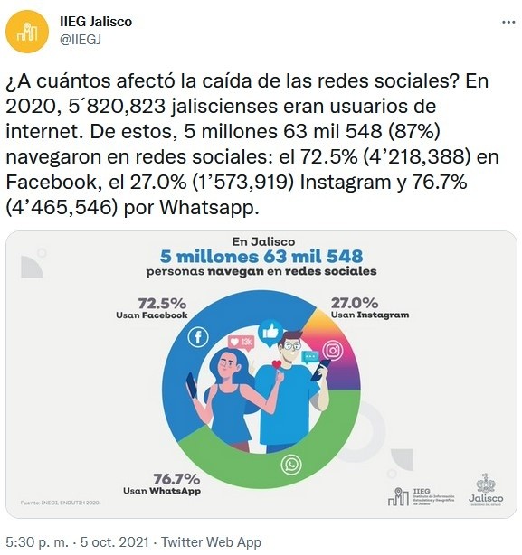 La caída de WhatsApp, Facebook e Instagram dejó ayer sin el servicio a usuarios de estas redes sociales alrededor del mundo, incluido México y los internautas de Jalisco.El apagón por seis horas de las aplicaciones de la compañía Facebook representa la falla "más importante nunca antes observada" por Downdetector, que monitorea los cortes online a nivel global. "Miles de millones de usuarios han sido impactados por la completa caída del servicio", escribió el sitio.Aunque no hay un registro preciso de los usuarios en Jalisco afectados por la caída de estas redes sociales, es posible una aproximación según datos estadísticos.El Instituto de Información Estadística y Geográfica del Estado de Jalisco (IIEG) intenta responder a esta pregunta con cifras del Inegi y la la Encuesta Nacional sobre Disponibilidad y Uso de Tecnologías de la Información en los Hogares (ENDUTIH) 2020.A través de Twitter, el IIEG compartió que en 2020, en Jalisco se contabilizaron 5 millones 820 mil 823 usuarios de internet. De ese total, 5 millones 63 mil 548 (87%) navegaron en redes sociales, considerando que algunos usan una o más de ellas:Con información de EFE***Si te interesó esta noticia y quieres saber más, entonces descarga y descubre INFORMAPlus, la aplicación digital de EL INFORMADOR, en donde tenemos contenidos exclusivos, seleccionados por nuestros editores, para darles una experiencia más completa a los lectores. Descarga la aplicación y pruébala GRATIS por treinta días. Para iOS: https://apple.co/35jaVgbPara Android: https://bit.ly/3gwVSEVSi eres suscriptor de EL INFORMADOR tu acceso está incluido, solicítalo al 33 3678-7777 IM