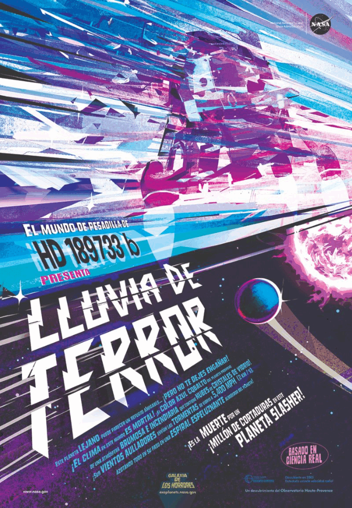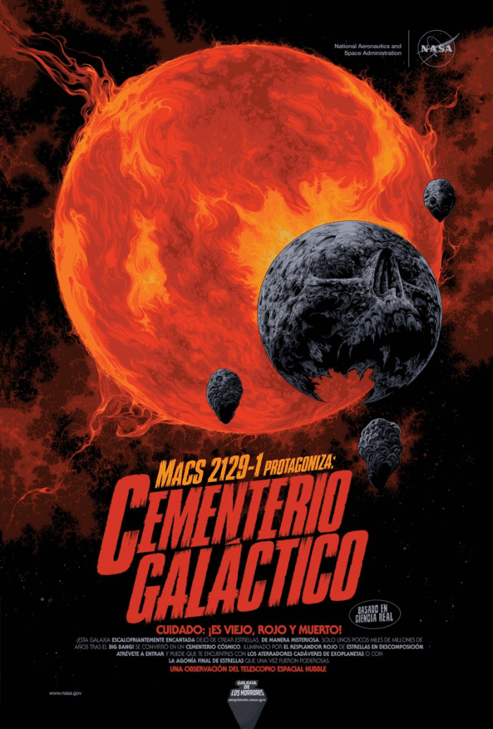 Gritos en la oscuridad, extrañezas del más allá, visiones macabras, todos hacen parte de los fenómenos espaciales que la ciencia investiga y revela.Para coincidir con la celebración de Halloween, conocida también como "La noche de las brujas", la Agencia Aeroespacial de Estados Unidos, NASA, ha lanzado una serie de afiches y fotografías que traen a la Tierra esos misterios del universo.Y lo han hecho en un estilo que imita a los afiches promocionales de las películas de ciencia ficción y horror de antaño.En anteriores ocasiones, la agencia ha publicado afiches que resaltan las maravillas de nuestro sistema solar y de otros planetas lejanos.Esta vez, sin embargo, los pósteres muestran un lado más siniestro y tenebroso -aunque verídico- de lo que se ha encontrado en los extremos del espacio.Como toda buena película que se quiera promocionar globalmente, los afiches tienen su versión en español. Aquí hay unos de ellos:AU Microscopii se encuentra entre uno de los sistemas planetarios más jóvenes jamás observados por los astrónomos, dice la NASA.Pero, ¿podrás soportar sus alaridos y berrinches cósmicos? Estos suceden porque el sistema tiene atrapado a un planeta, AU Mic b, dentro de una tormenta de explosiones mortales de rayos X.¡No hay escapatoria! Suponiendo que salgas, podrías en la red de materia oscura.La materia oscura es algo extraño y misterioso que se arrastra por el cosmos.Crea un enredo complejo y disperso que forma el esqueleto del universo.No sólo eso, es invisible, y sólo algunos valientes científicos se han atrevido a investigar sus secretos.Pero, ¡cuidado!, a la vuelta están los macabros demonios de rayos gama.Habitan en las profundidades del universo, donde los centros de dos estrellas colapsadas se funden para despedir estallidos de la luz más poderosa y mortal.Estos rayos de luz brillan un millón de billones de veces más que nuestro Sol.Con tanta luz tal vez no te molestarían unos días de lluvia; pero no si se trata de ¡Lluvias de Terror!El clima en el planeta HD 189733 es mortal.Vientos estruendosos lanzan afilados trozos de vidrio a más de 8.500 km/h envolviendo todo a su paso.Este es sin duda el destripador más violento de todos los exoplanetas. Si te atrapa terminarás como zombi, pero no te preocupes, también hay mundos para eso.Los mundos zombies son lugares de las estrellas no muertas -las pulsares- que atrapan todos los planetas a su paso.No te acerques mucho a estos mundos condenados pues terminarías en el Cementerio Galáctico.Esta misteriosa, fría y poseída galaxia dejó de producir estrellas sólo unos pocos de miles de millones de años después del Big Bang.Se convirtió en una morgue cósmica, iluminada por el resplandor rojo ensangrentado de sus estrellas en descomposición.Las ilustraciones tenebrosas y los macabros titulares hacen que estos fenómenos parecieran ficción, pero son ciencia real.Y la NASA no se los está imaginando, pues también ha logrado captar imágenes de cómo lugares en el universo reflejan el Halloween.Está foto de las regiones activas del Sol que se ven como una cómica calabaza sonriente:Los relámpagos en la atmósfera de Júpiter como una delicada hada flotante:La idea de los creadores de los afiches y fotografías es fomentar el interés en estos temas espaciales para que aprendamos más del universo del que formamos parte.Todas las fotos son de la Agencia Aeroespacial de Estados Unidos: NASA/JPL***Ahora puedes recibir notificaciones de BBC Mundo. Descarga la nueva versión de nuestra app y actívalas para no perderte nuestro mejor contenido.