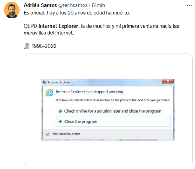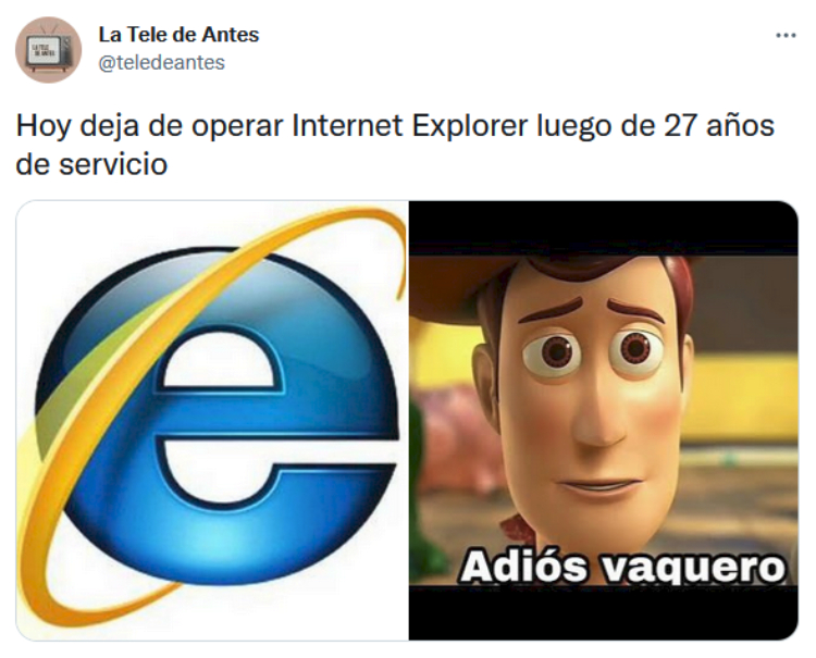 El final de una era tiene esta fecha marcada. Será a partir de hoy miércoles 15 de junio cuando el mítico navegador Internet Explorer quede fuera de línea.Tras 27 años de servicio activo, Microsoft dejará de dar soporte a Internet Explorer para enfocarse de lleno en Microsoft Edge, su nuevo navegador que ya lleva presentando hace un tiempo y se encuentra en funcionamiento.La noticia del final de Explorer se conoce desde hace un año, cuando Microsoft anunció en mayo de 2021, que se daría fin al navegador Explorer 11, debido a problemas de compatibilidad con algunos elementos y versiones futuras de los sistemas operativos como Windows 10.Como respuesta a su ausencia, Microsoft alentó a sus usuarios a utilizar su nuevo navegador Edge, el cual señaló, se adaptaría mejor a la nueva era. Es así que la firma aseguró que la transición sería amigable, sobre todo para aquellos usuarios que han usado el navegador desde los años 90, ya que Edge posee el modo Internet Explorer (IE), es decir, que es posible ingresar a los sitios webs y aplicaciones antiguas que se usaban en Explorer desde el nuevo navegador.A través de memes y chistes, usuarios de redes sociales han compartido divertidos mensajes para darle último adiós a esta icónica plataforma, que estuvo presente en los equipos de escritorio de más de una generación durante casi tres décadas."Te empiezan a olvidar Internet Explorer", escriben los usuarios antes de compartir su imagen en Twitter.OF