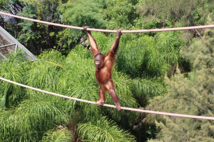 Los orangutanes están considerados dentro de los grandes simios junto con gorilas y chimpancés, pues se trata del segundo primate de mayor tamaño; lamentablemente se encuentra en grave peligro de extinción debido, principalmente, a la destrucción de su hábitat, la caza furtiva y comercio ilegal; así, los zoológicos modernos como el Zoológico Guadalajara, son actualmente uno de los últimos refugios para la conservación de esta especie que, se estima, al ritmo actual, podría desaparecer de su hábitat natural en los próximos 20 o 25 años.En este sentido, los orangutanes son originarios de Indonesia y Malasia; habitan en las copas de los árboles de las selvas tropicales donde consiguen su alimento que consiste en frutas, hojas, cortezas e insectos. Su nombre se deriva del malayo Orang (hombre) y Hutan (selva) y quiere decir, hombre de la selva.Ahora, los orangutanes son muy inteligentes, pueden crear sus propias herramientas –que utilizan para recolectar sus alimentos– o hacer sus nidos en las copas de los árboles; se distinguen de otros primates por su característico color rojizo y sus largos brazos, los cuales pueden alcanzar hasta tres metros de envergadura, y los dedos de sus manos son largos y fuertes para asirse de las ramas y balancearse, además sus pies también son prensiles con pulgar oponible.Los orangutanes, de este modo, son semi solitarios, pero existe una relación muy estrecha entre madres y crías, este periodo de dependencia es el más largo de todos los animales en la Tierra; pues las madres son muy dedicadas con sus crías, cuando son pequeñas las traen sujetas a su cuerpo y conforme van creciendo van ganando independencia.El periodo de gestación es de 9 meses y solo paren una cría por parto.El Zoológico Guadalajara es el único en Latinoamérica que cuenta con una familia de orangutanes, está compuesta por las hembras A-me (36 años) y Mei-ni (21 años), y los machos Nojosh (14 años), Chemita (9 años) y Mantan (5 años), todos ellos nacidos en el zoológico. Pero la familia crece, y nos da mucho gusto presentar a las dos más pequeñitas del grupo, con tan solo 5 meses de nacimiento, ellas son Jandi y Mei-sha que ahora se pueden conocer en su nuevo y más grande albergue ubicado en la Selva Tropical del Zoológico Guadalajara.Kalimantan, el palacio de los orangutanes, cuenta con 700 metros cuadrados (m2), 4 columnas de 10 metros que se conectan mediante sogas, espacio de descanso y una gran área verde donde los orangutanes podrán ejercitarse, pero sobre todo juguetear que es lo que más disfrutan hacer. Y sí, los seguiremos viendo en la Ruta Orangután, desplazándose a más de 15 metros de altura. Kalimantan es el nombre en indonesio que recibe la isla de Borneo, de donde es originaria esta especie de orangutanes, como la que habita en el zoológico.Kalimantan, el palacio de los orangutanes, ya está en funcionamiento y en espera de que todos los visitantes al parque lo conozcan durante estas vacaciones de verano.Esta nueva atracción está incluida en los tres paquetes de visita: GuadaZoo (básico), Premier y Diamante.PC