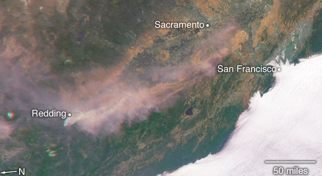 La Administración Nacional de la Aeronáutica y del Espacio (NASA, por sus siglas en inglés), dio a conocer nuevas fotografías satelitales de los incendios forestales que han afectado a California, Estados Unidos. Uno de estos es el incendio de Ferguson que ardió el 13 de julio en el Bosque Nacional Sierra, al oeste del Parque Nacional Yosemite. De acuerdo con la NASA gran parte de dicho bosque sufrió estrés extremo en esta área debido a la prolongada sequía de 2012 a 2017, situación que dejó una gran cantidad de árboles muertos. Asimismo, el 23 de julio ocurrió otro incendio al noroeste del lago Whiskeytown, norte de California, el cual avanzó de manera rápida a la ciudad de Redding, lo que generó evacuaciones masivas. El instrumento MISR en el satélite Terra de la NASA recolectó, a través de sus nueve cámaras que enfocan a la Tierra de diferentes ángulos, las imágenes de ambos incendios mientras pasaba por California el 27 y 29 de julio. Los científicos emplean la información angular de las imágenes de MISR para calcular la altura de la columna de humo, cuyos resultados se superponen en el lado derecho de cada figura. Los datos finales muestran que el humo de los dos incendios, permaneció cerca del suelo; esto tuvo un impacto sobre la calidad del aire local durante esos días.JB