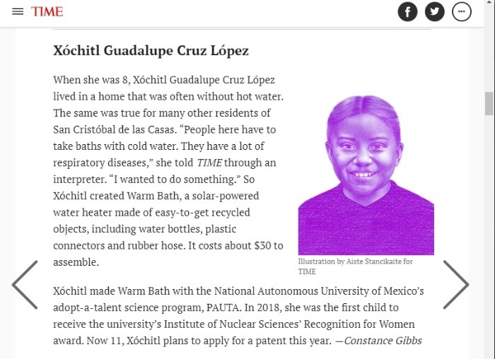 En el último número de la revista "Time", Xóchitl Guadalupe Cruz López, una estudiante mexicana de 10 años, fue distinguida en un artículo como una de las jóvenes innovadoras más sobresalientes, que utilizan ciencia, tecnología, ingeniería o matemáticas para inventar soluciones a los problemas que enfrentan las personas de todo el mundo.Xóchitl, originaria de la zona Altos de Chiapas, creó Warm Bath, un calentador solar de agua hecho de objetos reciclables como botellas y mangueras de goma, en su propio domicilio. "La gente aquí tiene que bañarse con agua fría. Tienen muchas enfermedades respiratorias", señaló a la revista.En 2018, recibió el "Reconocimiento ICN a la Mujer", que otorga el Instituto de Ciencia Nuclear de la UNAM, por demostrar aptitudes sobresalientes para el trabajo de divulgación científica."Xóchitl hizo un baño tibio con el programa de ciencia de adopción de talentos PAUTA de la Universidad Nacional Autónoma de México", publicó Time.Además de la mexicana, los jóvenes Shubham Banerjee (Bélgica), Gitanjali Rao (Estados Unidos), Fionn Ferreira (Irlanda), Riya Karumanchi (Canadá), Erin Smith (Estados Unidos), Neil Deshmukh (Estados Unidos).JM