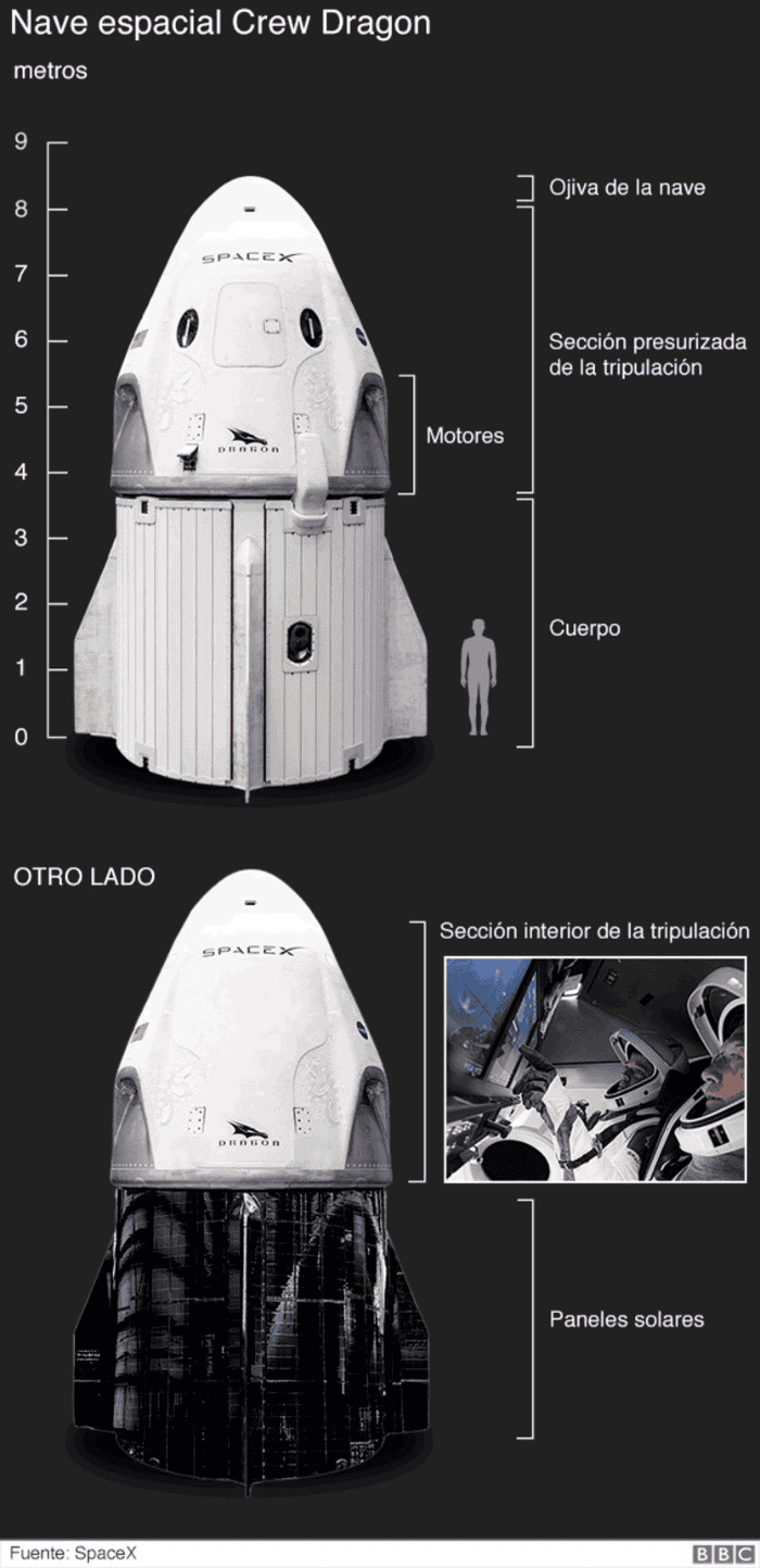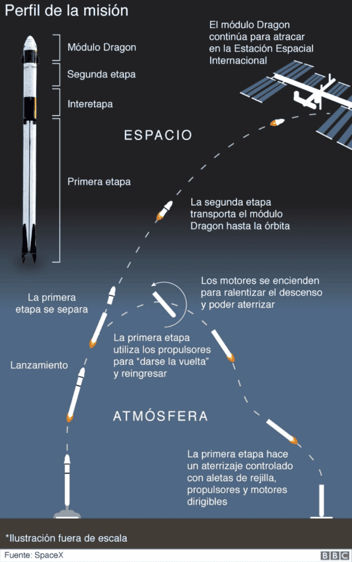 Es la primera misión de la NASA, la agencia espacial estadounidense, y una compañía privada, y da el pistoletazo de salida a la era de los viajes comerciales al espacio.El evento está previsto para el miércoles a las 4:32 p.m. (21:32 GMT) desde Cabo Cañaveral, Florida. Y si el tiempo no acompaña, hay una segunda fecha: el sábado 30 de mayo.El lanzamiento ha levantado tanta expectación que incluso espera la presencia del presidente de Estados Unidos, Donald Trump.La BBC responde algunas de las preguntas más comunes sobre esta misión.La NASA ha estado planeando externalizar el transporte de tripulación a la Estación Espacial Internacional (EEI) desde comienzos de los años 2000.Después del accidente del transbordador espacial Columbia durante su retorno a la Tierra en 2003, la agencia espacial se centró en desarrollar una nave de reemplazo que pudiera viajar a la Luna.Incluir a empresas privadas en el traslado de tripulantes y mercancías a la EEI era un paso necesario para poder financiar el programa.En 2014, la empresa de Elon Musk SpaceX y el gigante aeroespacial Boeing resultaron ganadores de un contrato de la NASA para el transporte de tripulantes.SpaceX hará su lanzamiento primero: la nave espacial Crew Dragon despegará el próximo miércoles sobre un cohete Falcon 9 desde el Kennedy Space Center, ubicado a unos 300 km al norte de Miami.SpaceX es una empresa estadounidense que ofrece servicios de lanzamiento comerciales y públicos en sus cohetes Falcon 9 y Falcon Heavy.El empresario Elon Musk fundó la compañía en 2002 con el objetivo de reducir los costos del transporte espacial y hacer posible la colonización de Marte.SpaceX fue la primera empresa privada en hacer regresar cohetes a la Tierra con energía de propulsión para que puedan volver a ser usados en lugar de ser desechados.Ha realizado envíos de mercancía a la EEI regularmente y ahora intentará iniciar el transporte de astronautas.La empresa de Musk también está desarrollado una nave más grande para transportar personas llamada Starship que podría empezar el proceso del asentamiento en Marte.Nacido en Sudáfrica, Elon Musk obtuvo más de US$160 millones con la venta del servicio de pago online PayPal a eBay.Su deseo de ver a la humanidad convertida en una verdadera civilización espacial fue el motor detrás de la creación de SpaceX.Pero también ha estado implicado en la fundación de una variedad de empresas, como la fabricante de autos eléctricos Tesla.También concibió el proyecto llamado Hyperloop, un medio de trasporte de alta velocidad que usa cápsulas que viajan a través de un sistema de tubos.Su colorida personalidad y estilo de vida lo convirtieron en inspiración para el personaje de Marvel Comics Tony Stark, interpretado por Robert Downey Jr.Musk no es ajeno a la controversia: sus tuits han dado lugar a demandas e incluso lo llevaron a tener que abandonar la presidencia de Tesla, aunque permaneció como director ejecutivo.Desde la retirada del programa de transbordadores espaciales en 2011, la NASA le ha estado pagando a Rusia decenas de millones de dólares para enviar a sus astronautas en la nave Soyuz.El lanzamiento de Crew Dragon desde Florida supone el primero de humanos desde territorio estadounidense en nueve años.Se ve como un paso crucial para restaurar el prestigio de EE.UU. en la carrera espacial.Será también la primera vez que una empresa privada ponga astronautas en órbita.La Crew Dragon es la nave espacial que transportará astronautas a la EEI el miércoles.Es una elegante evolución de la nave Dragon que fue construida para transportar mercancía a dicho puesto remoto.La Crew Dragon está diseñada para transportar un máximo de siete pasajeros, pero los vuelos de la NASA llevarán cuatro, y el resto del espacio se destinará a suministros.Está equipada con propulsores que le hacen posible maniobrar en el espacio y acoplarse a la estación espacial bajo control autónomo.A diferencia de naves espaciales anteriores, la cabina de la tripulación incluye controles de pantalla táctil en lugar de botones físicos.Bob Behnken y Doug Hurley son astronautas de la NASA.Fueron seleccionados en el año 2000 y cada uno ha volado al espacio dos veces en transbordador. Son de los más experimentados del equipo de astronautas y los dos tienen formación de pilotos de prueba, algo esencial para dirigir la nueva nave espacial.Hurley ha pasado un total de 28 días y 11 horas en el espacio, mientras que Behnken ha acumulado un total de 29 días y 12 horas, incluyendo 37 horas de paseo espacial.Las naves diseñadas para transportar astronautas tienen que superar un proceso que asegure que pueden operar de forma segura.El lanzamiento es, en esencia, el último paso del proceso de validación.Una vez en órbita, Behnken y Hurley probarán el sistema de control ambiental de la Crew Dragon, los monitores y controles y los propulsores para maniobrar.Monitorearán el sistema autónomo de acoplamiento durante la aproximación a la estación espacial y pasarán a ser miembros de la tripulación de la EEI.En ese puesto remoto en órbita continuarán realizando pruebas en la Crew Dragon además de otras tareas relacionadas con la estación espacial.Cuando llegue el momento de regresar a la Tierra, la Crew Dragon los lanzará en paracaídas al océano Atlántico.La cápsula y la tripulación serán recogidas por un barco llamado Go Navigator.La Crew Dragon tiene un sistema interno para abortar la operación diseñado para salvar la vida de los tripulantes en caso de emergencia.Si hay un problema durante el ascenso, como que se pare un motor del cohete, la nave prenderá motores para propulsar la cápsula con sus ocupantes y desprenderse del cohete.La cápsula caerá de forma segura gracias a un paracaídas.SpaceX realizó con éxito una prueba de este sistema el pasado 19 de enero.Los trajes espaciales que Behnken y Hurley vestirán en la cápsula se ven muy distintos a anteriores diseñ