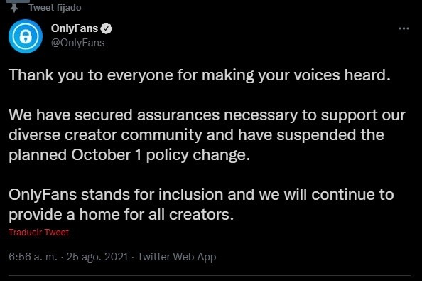 OnlyFans anunció el miércoles que había dado marcha atrás en su decisión de prohibir el contenido sexualmente explícito."Hemos obtenido las garantías necesarias para apoyar a nuestra diversa comunidad de creadores y hemos suspendido el cambio de política planificado para el 1 de octubre", anunció OnlyFans en su cuenta de Twitter.Previamente, la empresa había vinculado la decisión a amenazas de los principales bancos de cortar lazos con la compañía, temiendo ver dañada su reputación.OnlyFans es una plataforma donde usuarios comparten fotos y videos eróticos a cambio del pago de una tarifa.***Si te interesó esta noticia y quieres saber más, entonces descarga y descubre INFORMAPlus, la aplicación digital de EL INFORMADOR, en donde tenemos contenidos exclusivos, seleccionados por nuestros editores, para darles una experiencia más completa a los lectores.Descarga la aplicación y pruébala GRATIS por treinta días.Para iOS: https://apple.co/35jaVgbPara Android: https://bit.ly/3gwVSEVSi eres suscriptor de EL INFORMADOR tu acceso está incluido, solicítalo al 33 3678-7777AC