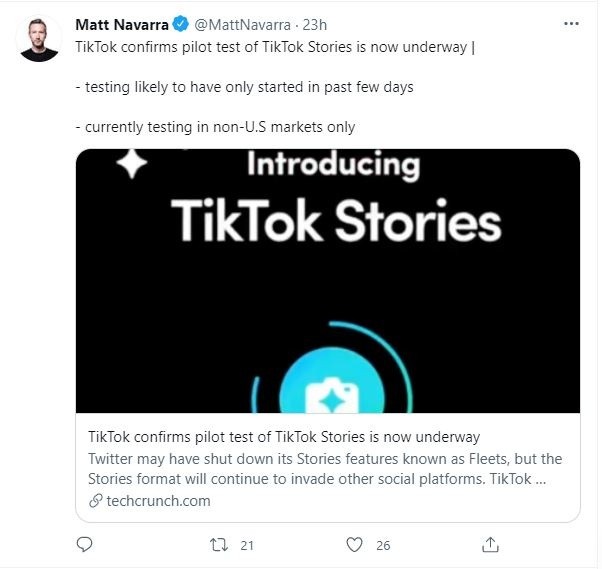 Una de las plataformas sociales más populares en la actualidad es TikTok, tiene millones de usuarios en todo el mundo y los videos más vistos se vuelven virales en todo internet. Su éxito ha sido tal que otras compañías han buscado imitar algunas de sus funciones pero ahora es la red social de origen chino la que está probando una herramienta muy socorrida por otros: las Historias.De acuerdo con un tweet compartido por el consultor de redes sociales, Matt Navarra, la compañía ha introducido la opción de realizar publicaciones que desaparecen después de 24 horas. TikTok le dijo a Variety que actualmente está probando la función con un pequeño subconjunto de usuarios fuera de los Estados Unidos. Sin embargo, dio a conocer que es probable que se no se convierta en un elemento permanente dentro de su aplicación."Siempre estamos pensando en nuevas formas de aportar valor a nuestra comunidad y enriquecer la experiencia de TikTok. Actualmente estamos experimentando formas de darles a los creadores formatos adicionales para que sus ideas creativas cobren vida para la comunidad de TikTok", dijo un portavoz de la compañía a Engadget.Al parecer la intención de TikTok con esta nueva función es mantenerse relevante, particularmente considerando que actualmente compañías como YouTube están invirtiendo millones para replicar su éxito.Hay que recordar que fue Snapchat la primera aplicación en presentar Historias, una opción que permite realizar publicaciones efímeras que desaparecen 24 horas. Con el tiempo el formato fue copiado ampliamente por todos los demás grandes competidores en las redes sociales, desde Facebook hasta LinkedIn.Así se ve la opción en TikTok.En noviembre de 2020 Twitter se unió a esta tendencia a través de su pestaña Fleets. Sin embargo, parece que los usuarios no la utilizaron mucho pues la compañía anunció que dejaría de estar disponible.Así, a través de un tweet, la compañía confirmó que el formato dejará de estar disponible: "eliminaremos Fleet el 3 de agosto, trabajando en algunas cosas nuevas. Lo sentimos o de nada". Por lo que ya no está disponible esta opción. Veremos cómo le va a TikTok.Si te interesó esta noticia y quieres saber más, entonces descarga y descubre INFORMAPlus, la aplicación digital de EL INFORMADOR, en donde tenemos contenidos exclusivos, seleccionados por nuestros editores, para darles una experiencia más completa a los lectores.Descarga la aplicación y pruébala GRATIS por treinta días.Para iOS: https://apple.co/35jaVgbPara Android: https://bit.ly/3gwVSEVSi eres suscriptor de EL INFORMADOR tu acceso está incluido, solicítalo al 33 3678-7777MB