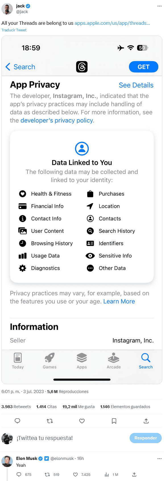 El confundador de Twitter Jack Dorsey y el propietario de esa red social, Elon Musk, señalaron que Threads, la nueva plataforma de conversaciones en línea que Meta planea lanzar el próximo jueves, recolectará todo tipo de datos de los usuarios.Con Threads (hilos), Meta, la empresa dueña de Facebook, Instagram y WhatsApp, pretende hacer la competencia a Twitter, que ha impuesto nuevas restricciones a sus usuarios bajo el mando del multimillonario Musk, según informaron anoche medios estadounidenses.La nueva aplicación de Meta ya está disponible en las tiendas de aplicaciones como Play Store, en la modalidad de acceso anticipado, y se pueden consultar sus condiciones de privacidad, que llamaron la atención de los dos antiguos consejeros delegados de Twitter.Según esa política, Threads puede recopilar datos de identidad, salud y forma física, financieros, del historial de navegación, compras, localización, contactos e "información sensible" del usuario, entre otros datos.En total, los datos pertenecen a unas 14 categorías y "pueden ser recolectados y vinculados a tu identidad", aunque Twitter no se queda lejos, ya que toma datos de 10 categorías, si bien no incluye los de salud, financieros, compras o información sensible.Dorsey publicó las condiciones de privacidad de Threads en su cuenta de Twitter con un mensaje irónico: "Todos tus Threads nos pertenen", a lo que Elon Musk reaccionó con una afirmación: "Yeah" (sí).Musk también respondió con ironía a un usuario que se hacía eco de que la idea de Meta era crear una red social "dirigida con cordura", según reportó un ejecutivo a un medio, a lo que el multimillonario comentó: "Gracias a Dios que ellos están dirigidos con tanta cordura".Según la descripción en las tiendas de aplicaciones, Threads quiere ser el "lugar donde las comunidades se reúnen para hablar de todo, desde los temas que te importan hoy a los que serán tendencia mañana", donde conectar con creadores y conseguir seguidores con los que "compartir ideas, opiniones y creatividad".OF
