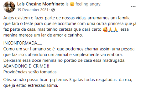 Fue a mediados de diciembre del año pasado cuando en la puerta de la usuaria de Facebook, Lais Chesine Mofrinato de Brasil compartió su sorpresa con sus seguidores tras encontrarse con una perrita abandonada, que estaba amarrada e incluso tenía cobija y algunas croquetas, además de una nota, algo que causó indignación en redes sociales.Al parecer la perrita fue abandonada a su suerte acompañada de una nota que decía “Lo siento. Por favor cuídala” sin más. A lo que Lais compartió la foto de la situación en sus redes sociales con un mensaje que decía “Como ser humano sí podemos llamar a una persona que abandona a un animal a su suerte. El abandono es un crimen”. Aunque tenía toda la intención de darle un hogar a la pequeña Lea como la nombraron, ella no podía adoptarla porque ya tiene tres gatos rescatados y no podía garantizarle el espacio y atención que requería, sin embargo, sí logró darle un hogar.Fue una amiga de Lais quien decidió darle la bienvenida a su familia y hacerle compañía a otro perro que ya era parte de ellos. Lea ahora tiene una nueva oportunidad y se encuentra sana y salva con ellos. "No me lo pensé dos veces, porque sé el cariño y el amor que ella y su familia dan a los animales", dijo Rosana tras dar a conocer que adoptó a la pequeña Lua. GC