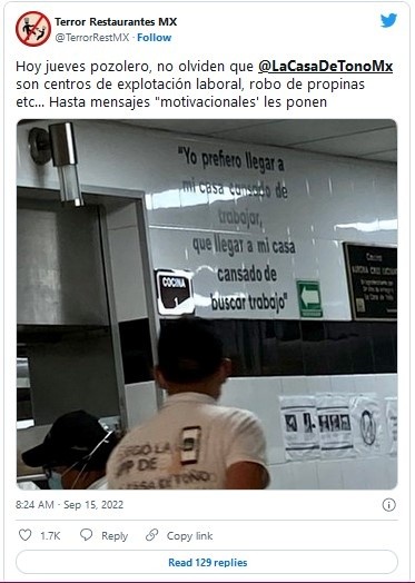 En los restaurantes suele haber momentos perturbadores. En redes sociales se viralizó una frase que adorna las instalaciones de "La Casa de Toño", un complejo de comida tradicional mexicana, y generó polémica entre los usuarios, pues coinciden en que existe una "explotación laboral".Por medio de Twitter, la cuenta: @TerrorRestMX compartió la curiosa imagen donde se aprecia lo que parece ser la cocina del restaurante con dicha frase polémica."Yo prefiero llegar a mi casa cansado de trabajar, que cansado de buscar trabajo", se lee el texto en la pared.Ante el hecho, usuarios de la red social criticaron a la cadena restaurantera, pues acusan que se trata de "explotación laboral"."Chale ya me quitaron las ganas de ir", "¿Todas las sucursales son así de malas con sus empleados?", "Toda la industria es así, ojo no estoy justificando, estoy señalando que lamentablemente el sector restaurantero en general es bien explotado", "Más que frase motivacional parece amenaza", "Totalmente, se ve súper pasivo agresivo el mensaje", son algunos de los comentarios de internautas.JM