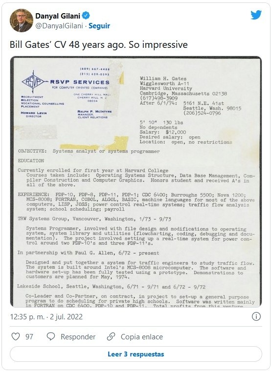 Los aspirantes a empleo a menudo luchan por hacer el currículum perfecto que les permita lograr la carrera de sus sueños. En muchos trabajos, un buen currículum es el primer criterio que debe cumplir un solicitante.Bill Gates, una de las personas más ricas del mundo, compartió hoy su primer currículum para aumentar la confianza de millones de jóvenes aspirantes a empleo en todo el mundo. Haciendo retroceder a sus seguidores en el tiempo, el hombre de 66 años compartió su currículum de hace 48 años.Dirigiéndose a sus seguidores de la red social LinkedIn, dijo que estaba seguro de que su currículum se ve mejor que el suyo."Ya sea que se haya graduado recientemente o haya abandonado la universidad, estoy seguro de que su currículum se ve mucho mejor que el mío hace 48 años", dijo el filántropo multimillonario.El currículum es de la época en que William Henry Gates III, conocido popularmente como Bill Gates, cursaba su primer año en la Universidad de Harvard.El jefe de Microsoft menciona que ha tomado cursos de estructura de sistemas operativos, manejo de bases de datos, gráficos por computadora y más.Varios usuarios dijeron que el currículum de Bill Gates es perfecto y le agradecieron por compartir el nostálgico momento."Teniendo en cuenta que este es un currículum de 48 años, ¡aunque todavía se ve genial!" comentó el usuario M Ismail."Gracias por compartir Bill Gates. Gran currículum de una página. Todos deberíamos guardar copias de nuestros currículums anteriores para volver y echar un vistazo. A veces, olvidamos cuánto hemos logrado en nuestras vidas", dijo otro usuario.JM