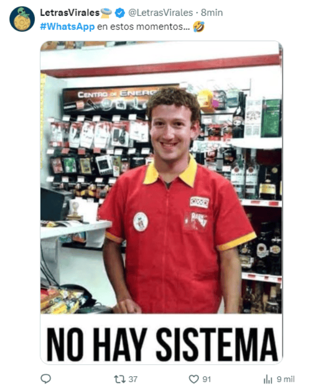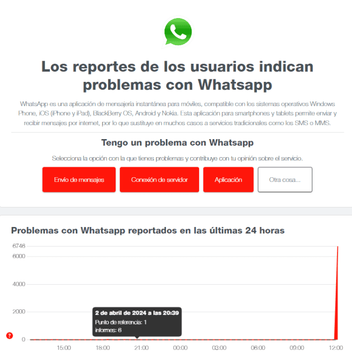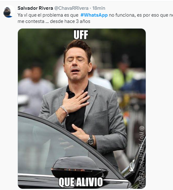 WhatsApp, una de las aplicaciones de mensajería más utilizadas en el mundo, reporta fallos importantes en sus versiones móviles y de web. En redes sociales, usuarios comenzaron a reportar un mal funcionamiento de la aplicación al momento de mandar y recibir mensajes.Según medios, las fallas son a nivel mundial. El sitio Downdetector, que detecta cuando un sitio web no está funcionando correctamente, registra, en efecto, problemas importantes con la aplicación. Facebook e Instagram también reportan fallos en sus respectivas plataformas, y también a nivel mundial. De inmediato las redes sociales se llenaron de memes por las constantes "caídas de la aplicación":El servicio se restableció después de media hora. FS