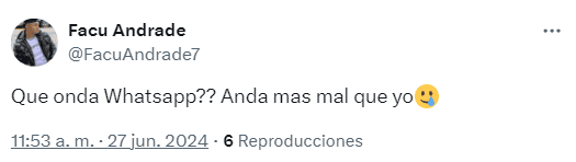 En redes sociales, usuarios de la aplicación de mensajería WhatsApp reportan que está fallando este jueves 27 de junio.Desde hace alrededor de dos horas, señalan que hay problemas en la app para cargar fotos, enviar mensajes, así como en los audios.El portal Downdetector indica que la falla ha estado desde las 09:25 de la mañana, mientras que entre las 10:25 y las 10:55 se presentaron más intermitencias.*Mantente al día con las noticias, únete a nuestro canal de WhatsApp OF